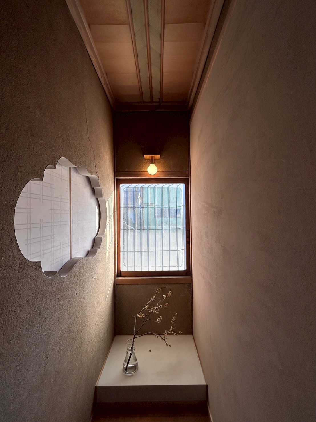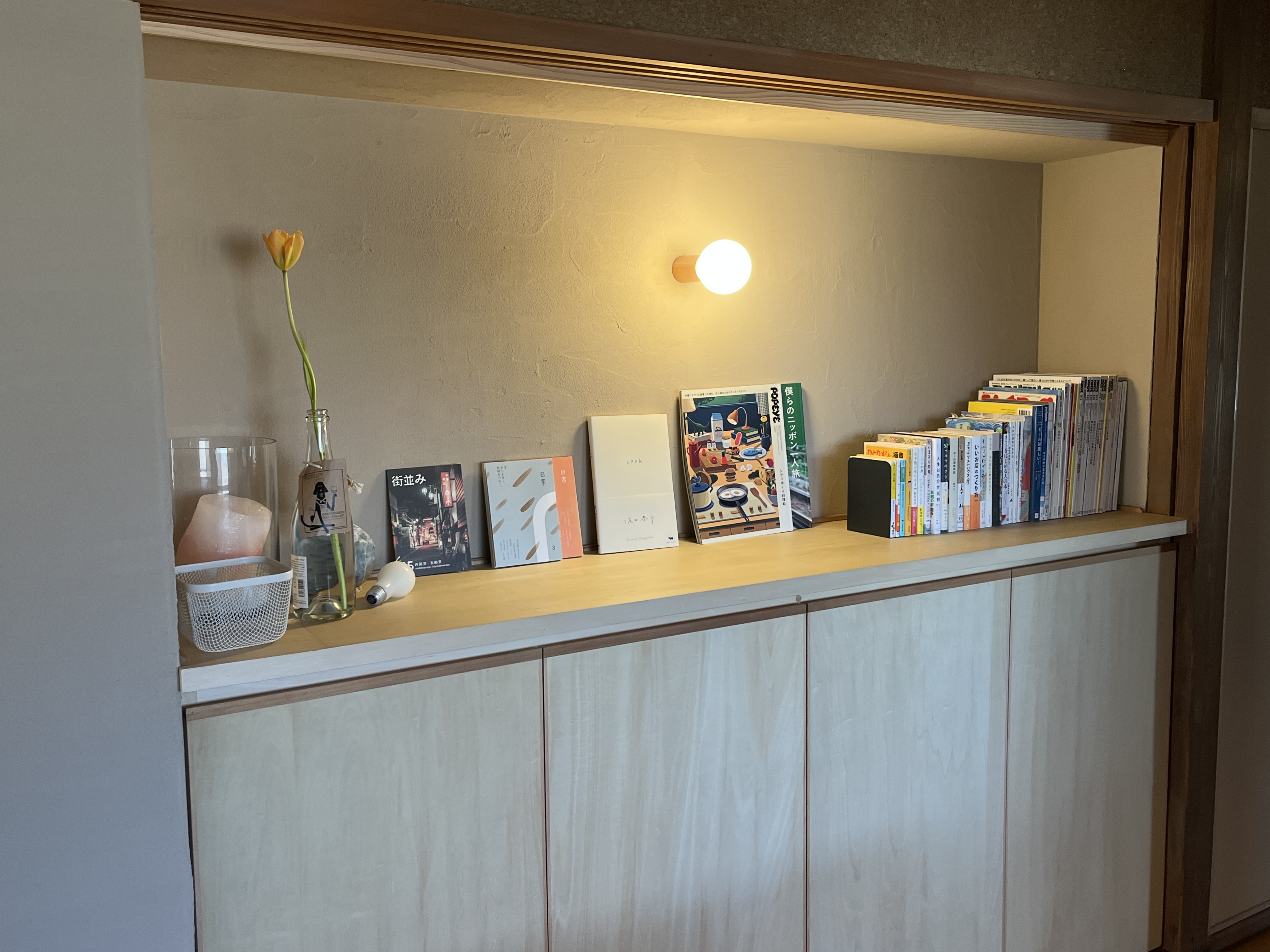 廊下の飾り棚。壁の漆喰もDIYで友人を誘い、みんなに協力してもらいながら塗りました。