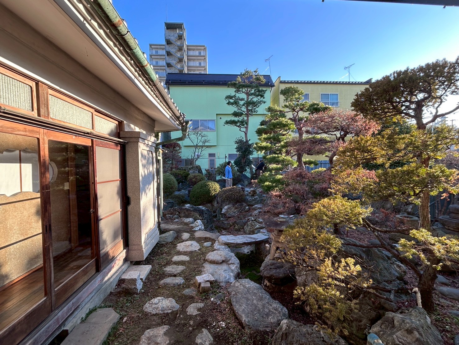 瓦屋根が立派で迫力のある表構えが特徴的な建物。アプローチの松の木も印象的です。