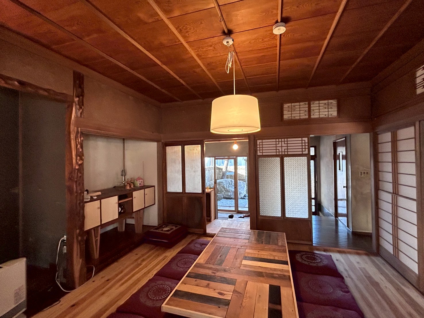 宿泊者の集まるラウンジ。古材をパッチワークしたテーブルは村上さんと南雲さんでDIYで制作しました。